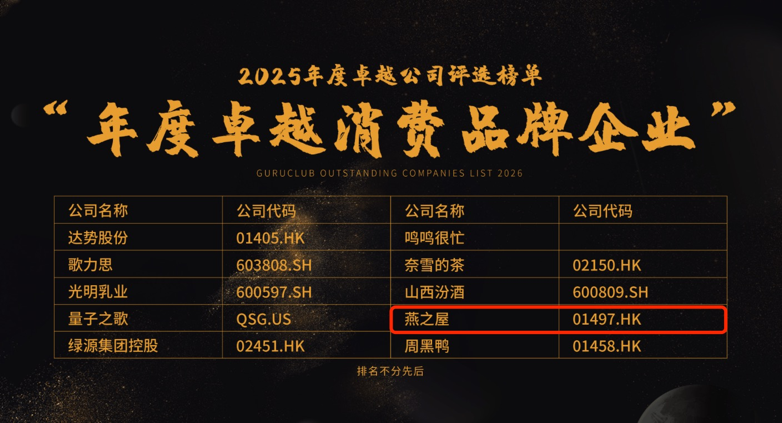 格隆匯以“全球視野,下注中國”為初衷,打造出投資圈中具參考價值的上市公司及獨角獸公司排行榜,評選覆蓋全球多家主流交易所的上市公司及獨角獸企業(yè)。2025年度卓越公司評選榜單——“年度卓越消費品牌企業(yè)”獎項旨在表彰在消費復蘇背景下表現(xiàn)突出的優(yōu)秀企業(yè),該獎項從品牌知名度、行業(yè)影響力、增長潛力等多個維度進行綜合評估,嚴格甄選出那些在高質量發(fā)展道路上展現(xiàn)韌性、勇于創(chuàng)新的企業(yè)。燕之屋憑借企業(yè)深厚實力登上該榜單。