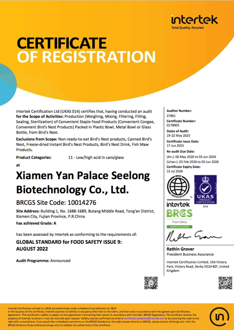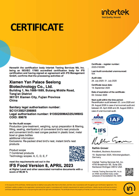 圖:燕之屋獲得BRC食品安全全球標準、IFS國際食品標準雙重認證